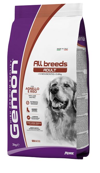 GEMON ALL BREEDS ADULT ar jēru un rīsiemPilnvērtīga lolojumdzīvnieku barība visu izmēru pieaugušiem suņiem