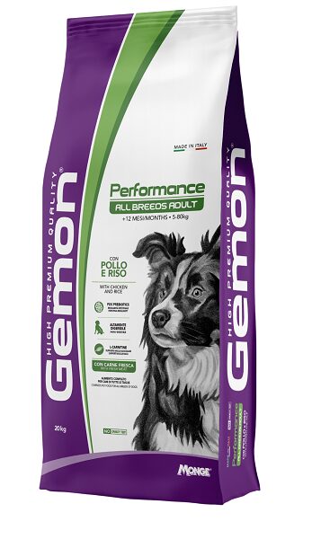 GEMON ALL BREEDS ADULT PERFORMANCE ar cāli un rīsiemPilnvērtīga lolojumdzīvnieku barība visu izmēru pieaugušiem suņiem